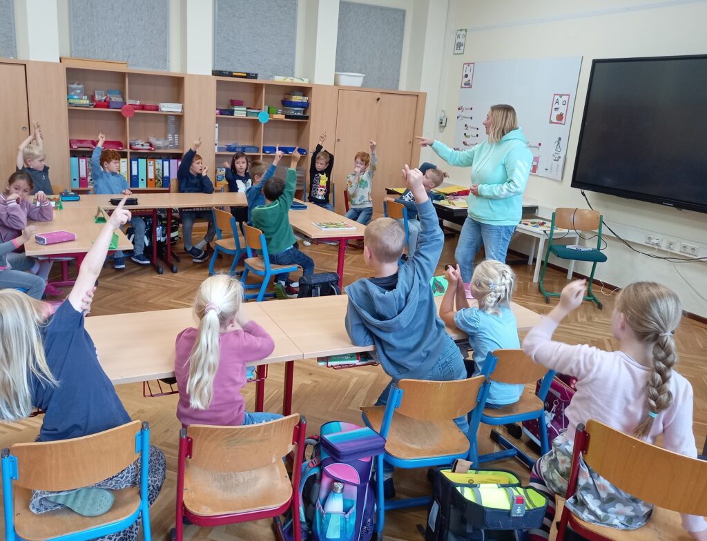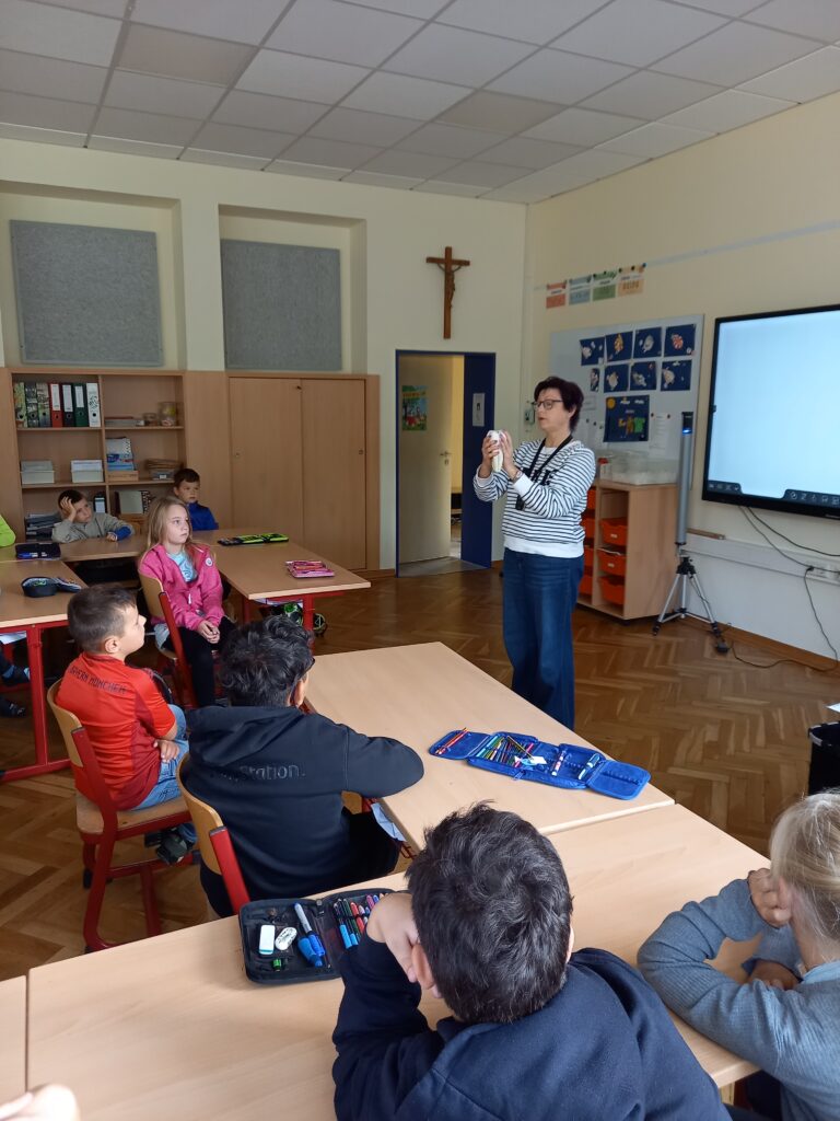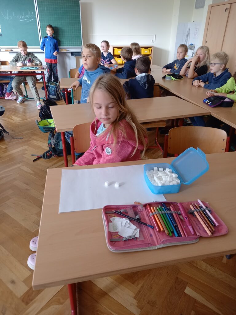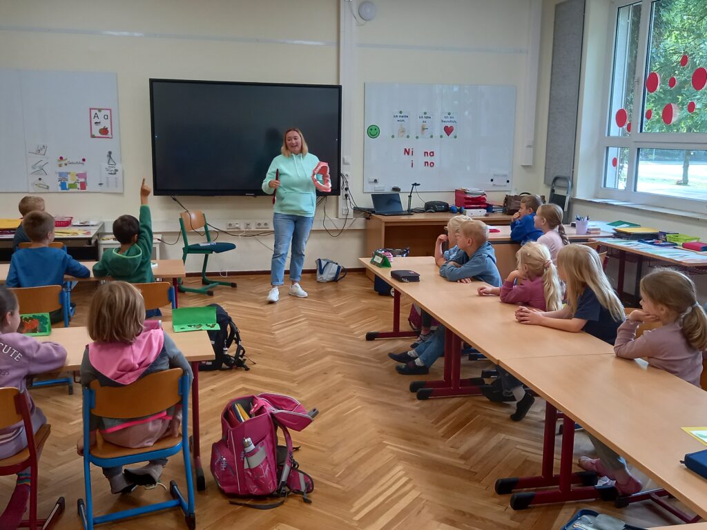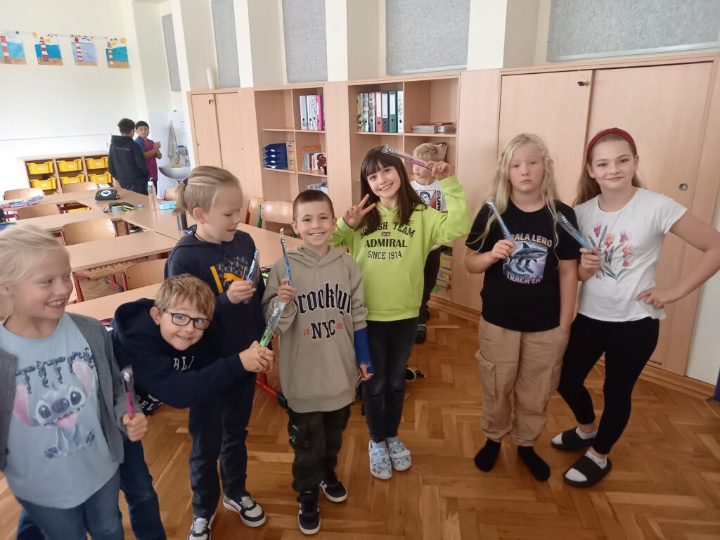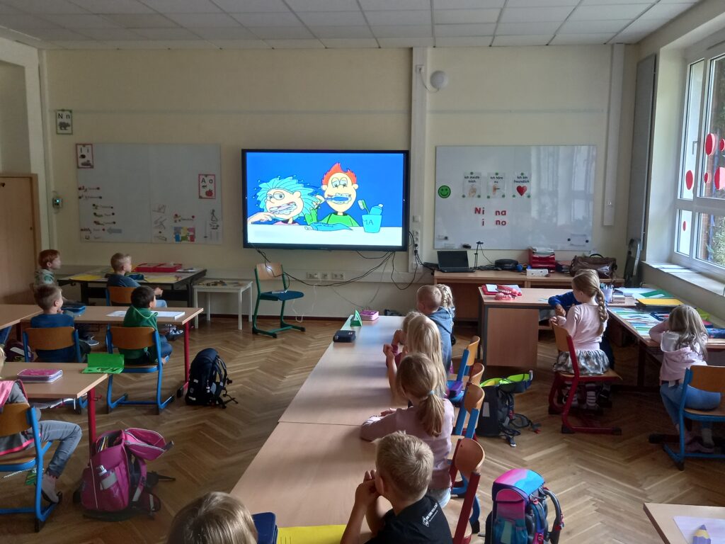 Am 15.09.2025 hatten wir Besuch vom Zahnprophylaxe-Team. Den Kindern wurde unter anderem erklärt, wie man sich richtig die Zähne putzt und warum regelmäßiges Zähneputzen so wichtig ist. Im Rahmen einer kleinen Geschichte wurden die Mahlzeiten eines Schulkindes im Laufe eines Tages aufgezählt und die Kinder mussten schätzen, wie viel Zucker jeweils in den Mahlzeiten enthalten ist. Am Ende hat jedes Kind noch eine Zahnbürste erhalten.