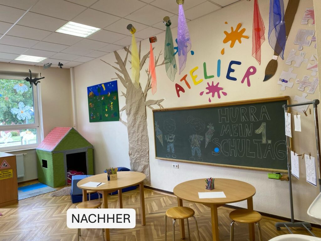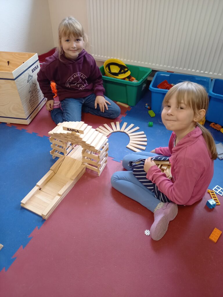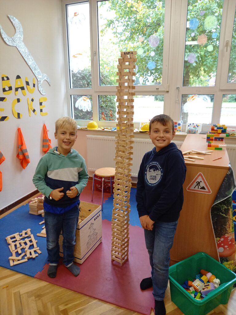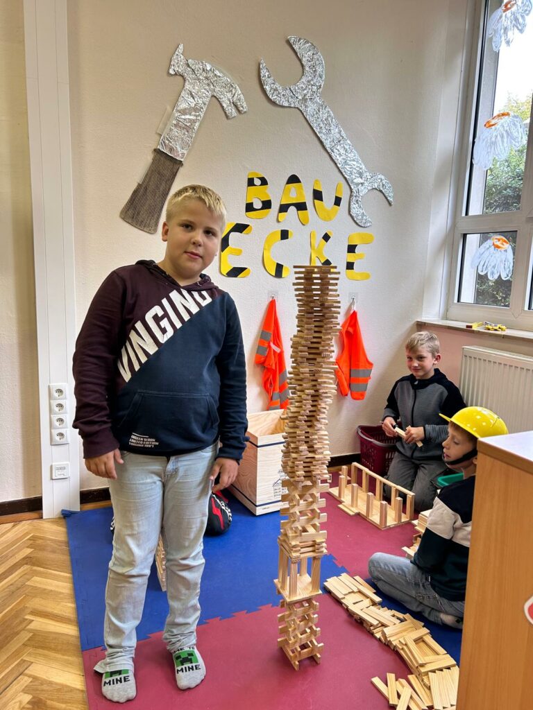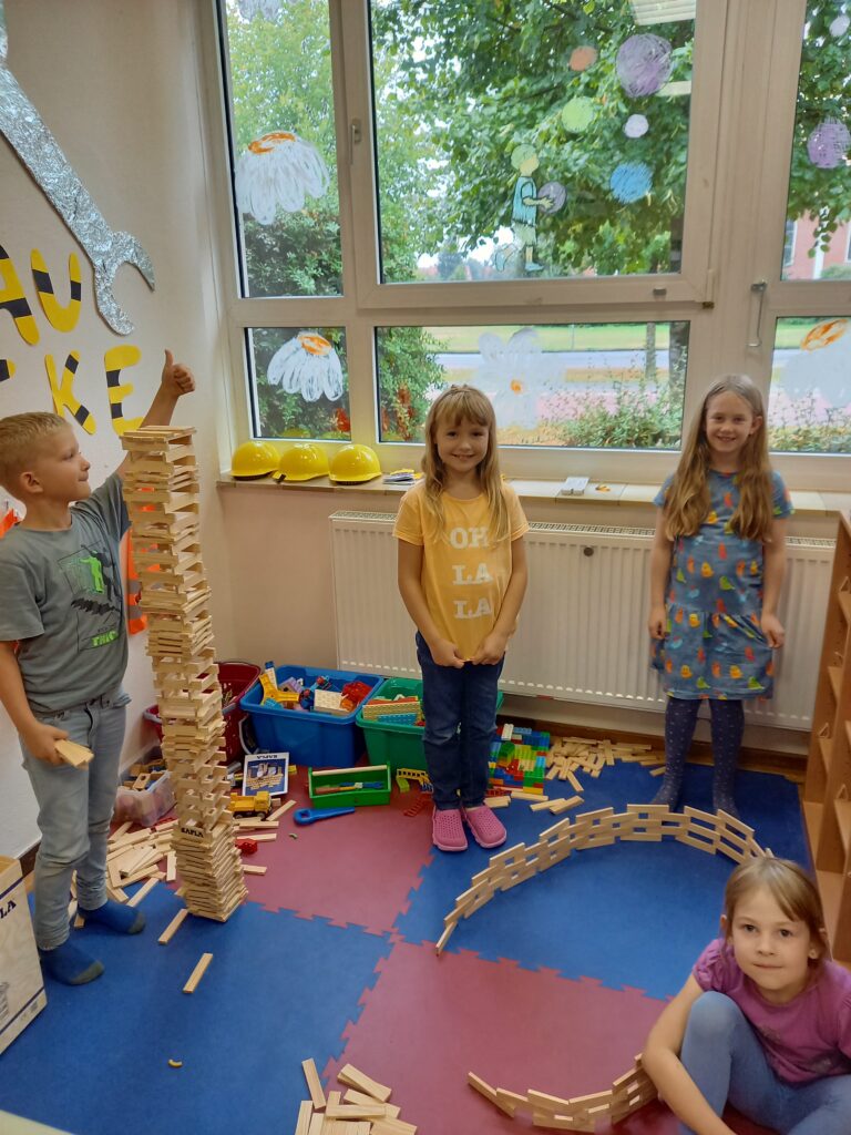 Bereits in den Sommerferien haben Frau Fischer-Rehnen und Frau Rehnen den Betreuungsraum farbenfroh umgestaltet und unter anderem die Bauecke und das Atelier verschönert bzw. neu eingerichtet. Die Bauecke wurde dann vor ein paar Wochen vom Förderverein noch mit Kapla-Steinen ausgestattet. Die Kinder spielen mit großer Begeisterung in der neuen Bauecke und bauen tolle Kunstwerke!