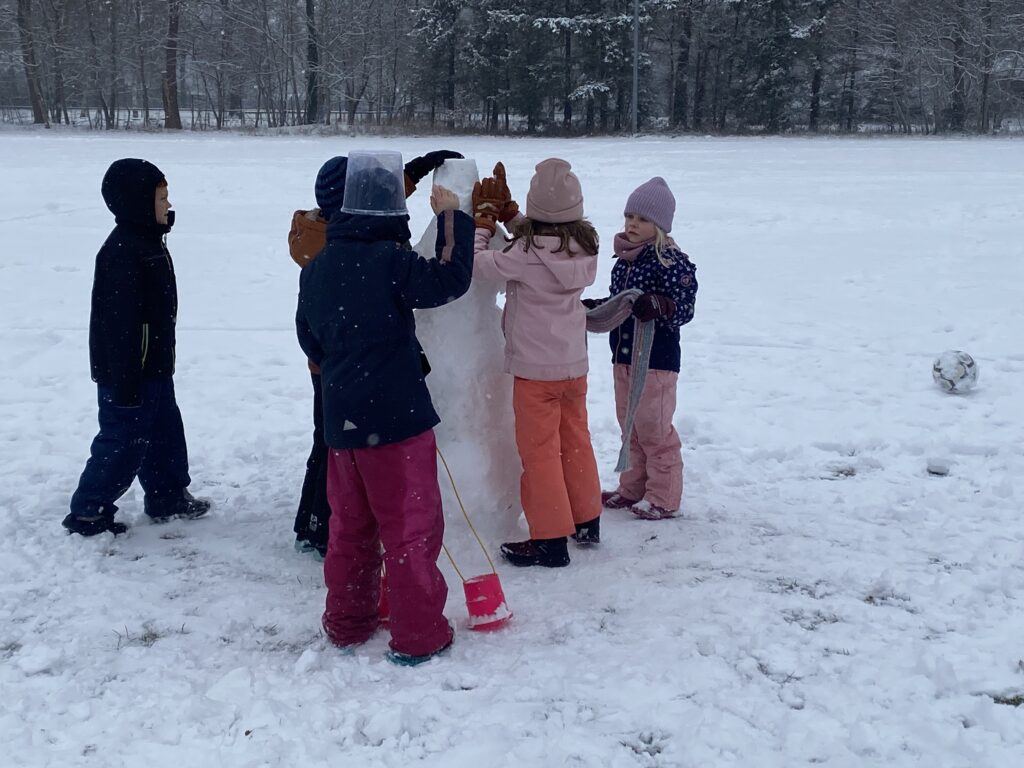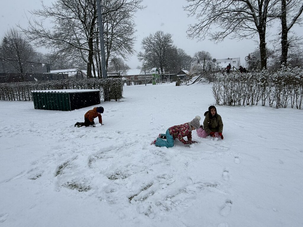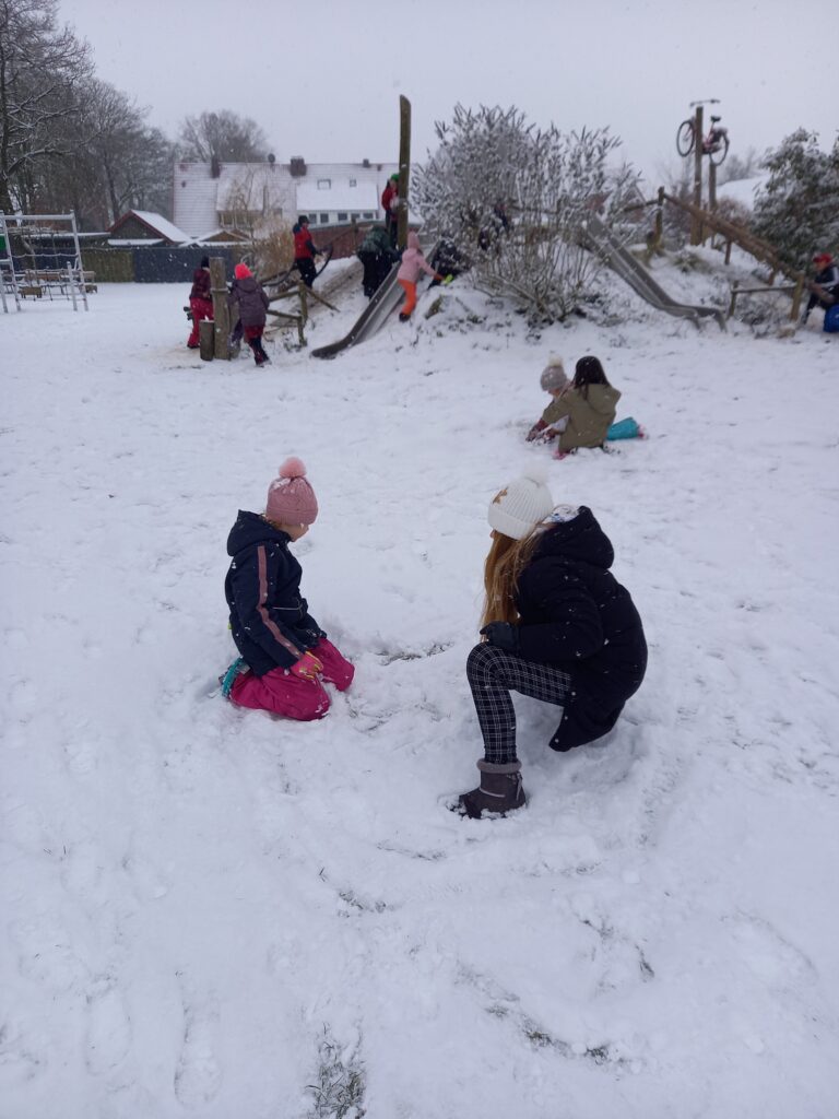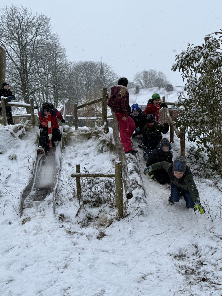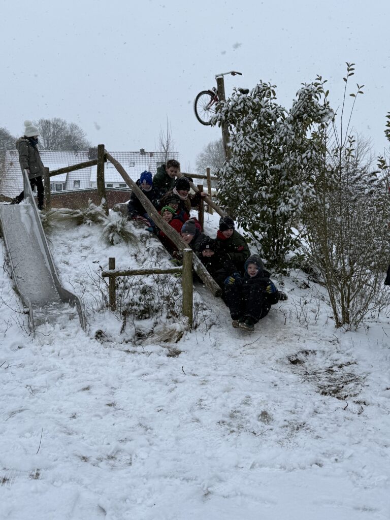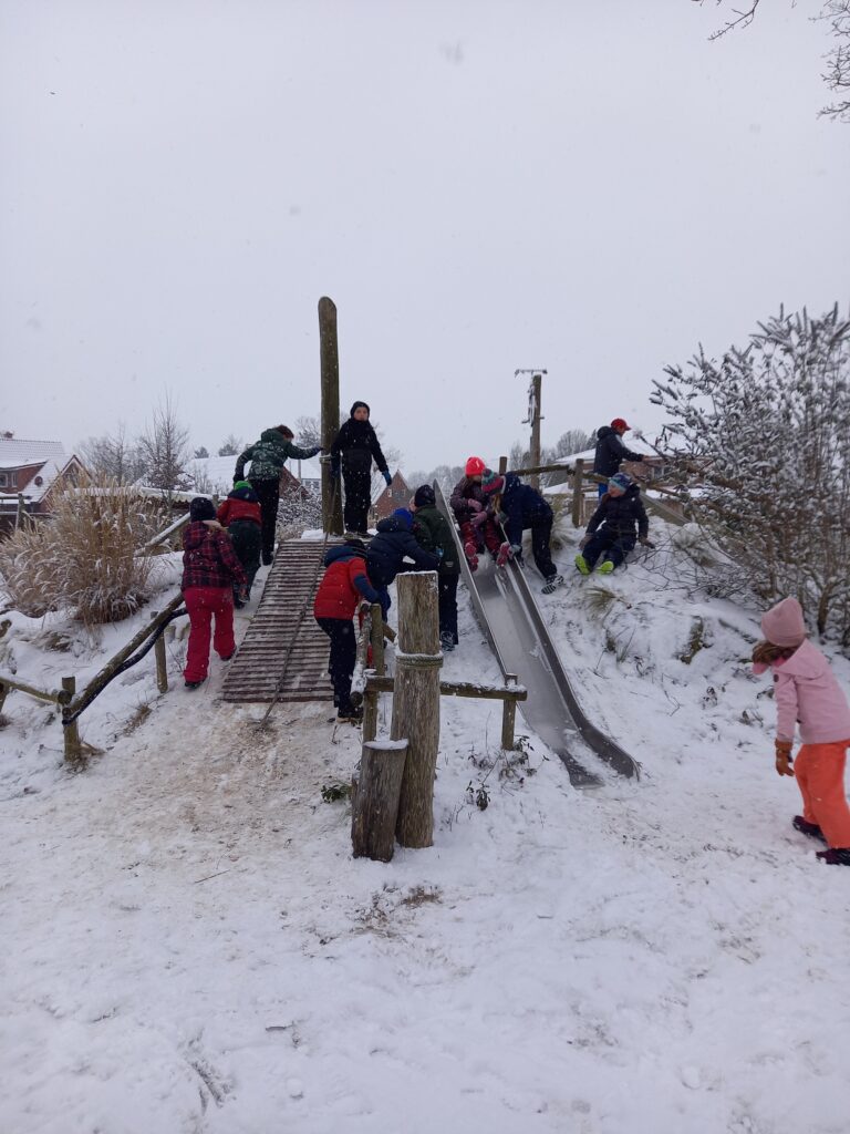 Der Winter hat noch einmal nachgelegt, sodass die Kinder in den Pausen und in der Betreuung wieder im Schnee spielen können. Besonders die Rutschen sind in solchen Tagen sehr beliebt.